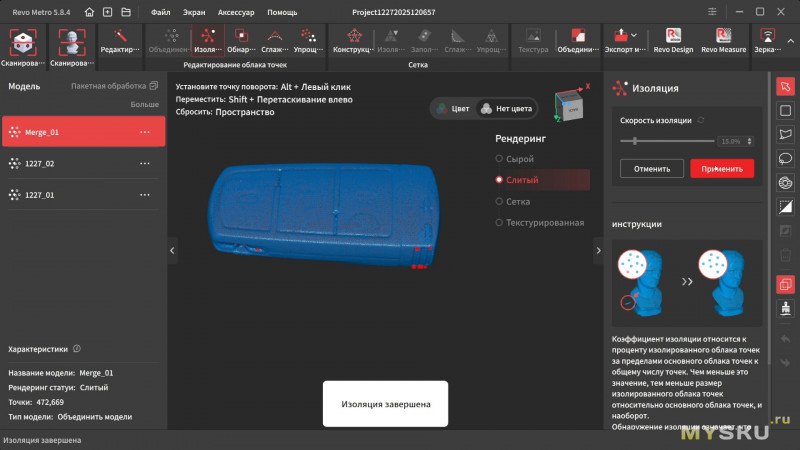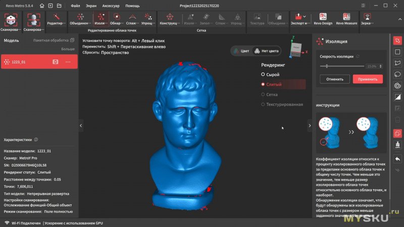 Дальше стандартная цепочка: облако, чистка изоляцией, исправление наложений, сетка.