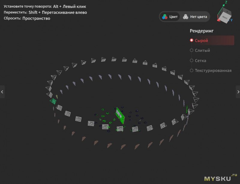 Спустя два оборота под разными углами накопилось всего 40 кадров. Можно нажать на любой снимок и посмотреть картинку с этого ракурса.