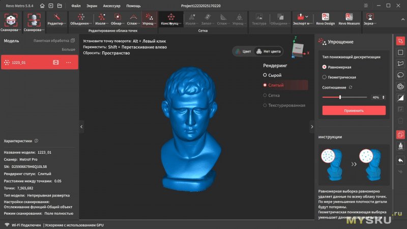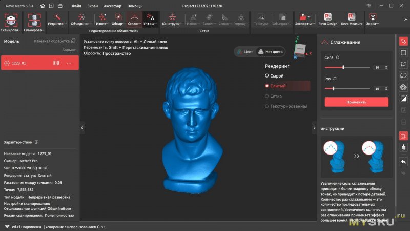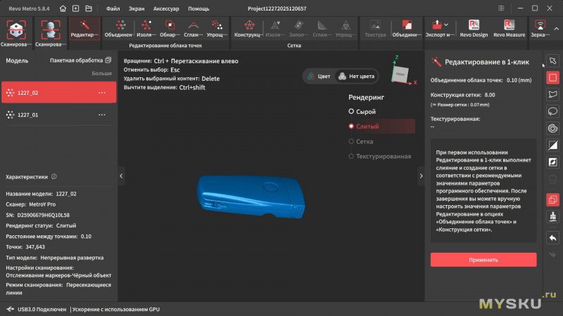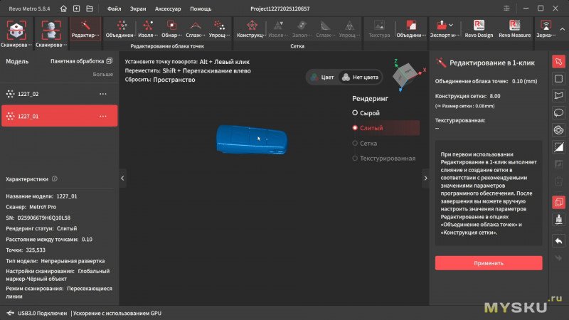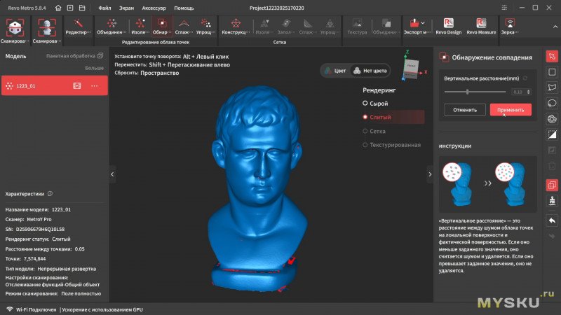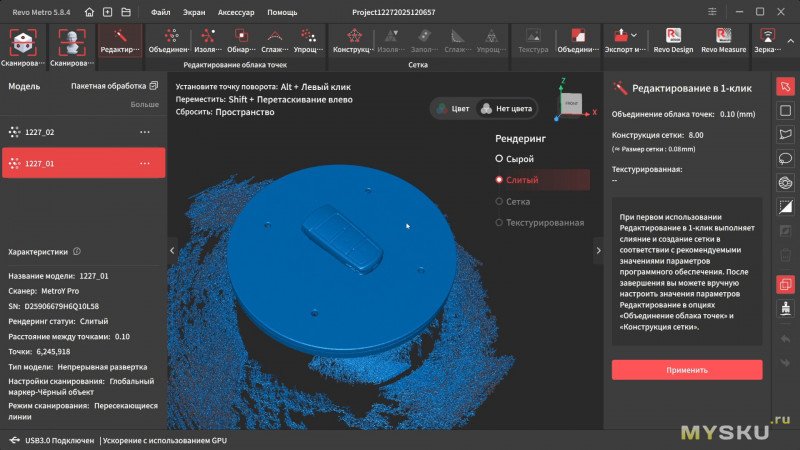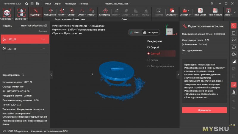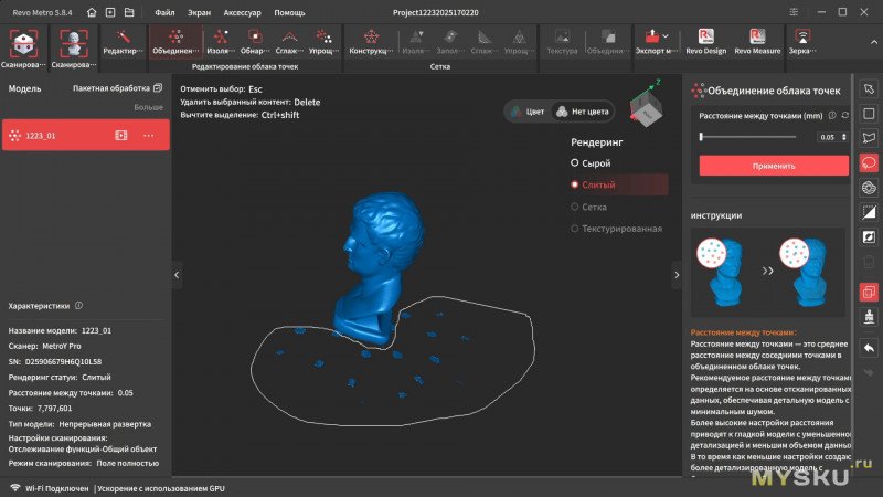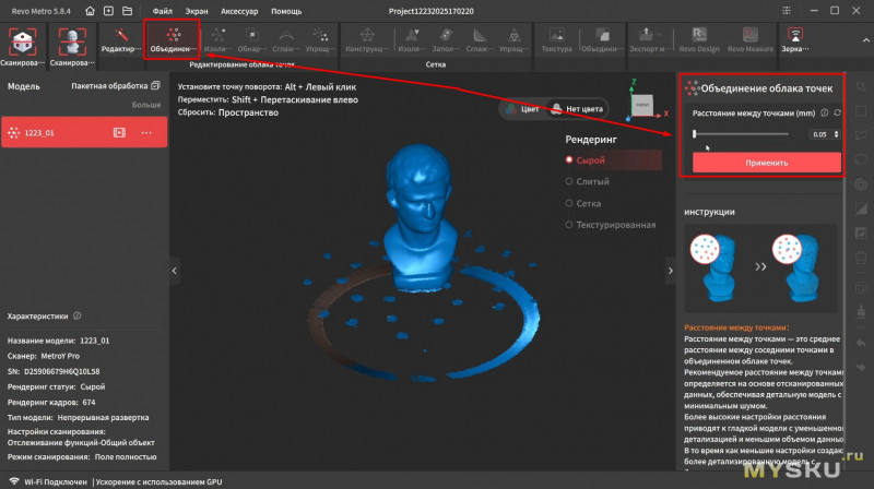Готовый результат рассматриваем в программе. Если всё гладко, запускаем объединение облака точек. Инструмент перебирает все 600+ кадров и оптимально распределяет точки. Шаг между ними можно задать от 0.05 мм до 2 мм. Для черновиков можно ставить значение побольше, это ускорит обработку. Я для оставил минимум. Жмем «Применить» и ожидаем пока заполнится полоса прогресса.