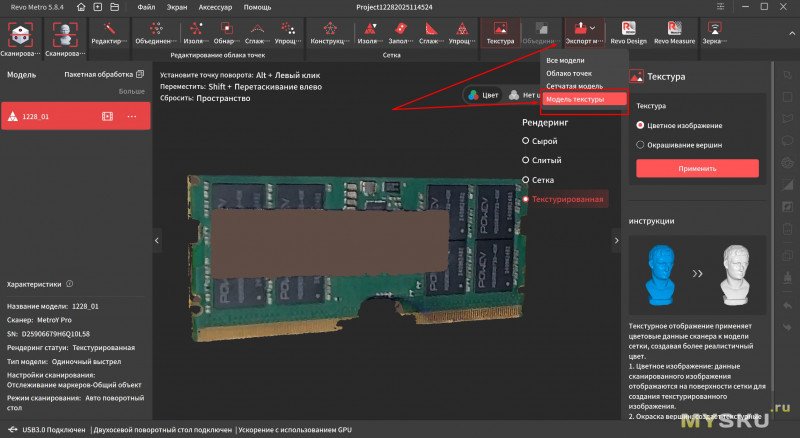 В меню экспорта появляется пункт «Модель текстуры». Сохранить её можно в PLY, OBJ, FBX или GLTF.