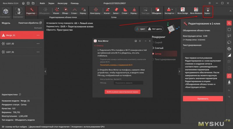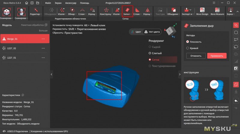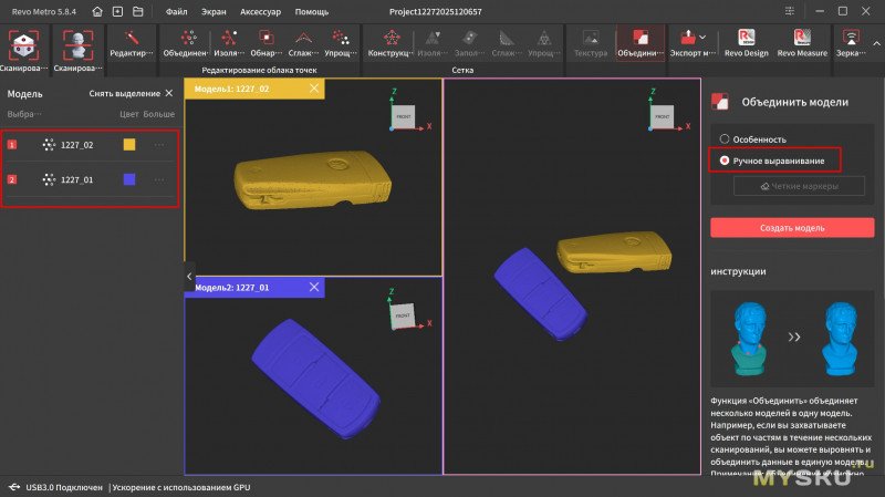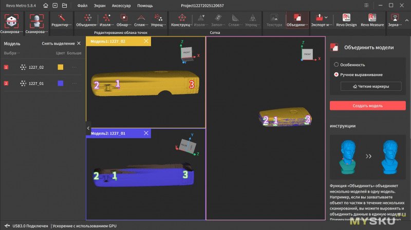 Две половинки готовы, остается только «сшить» их в одну, используя инструмент «Объединение модели». Выделяем два скана. Автоматика обычно срабатывает хорошо если есть общая геометрия. Но тут две половинки относительно симметричны и алгоритм может просто наложить половинки друг на друга.