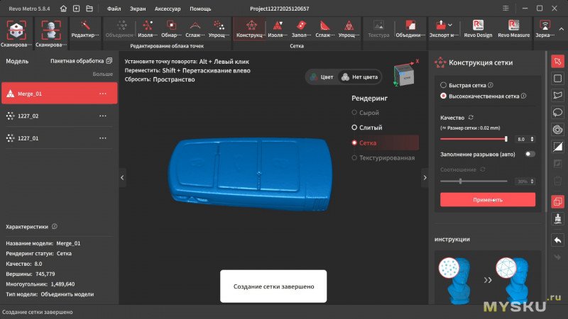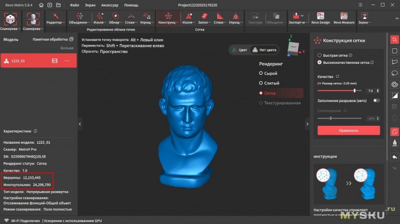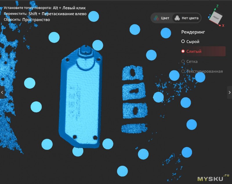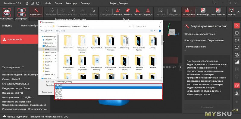 Экспортировать можно и облако точек (для профильного софта), и готовую сетку в формате STL.