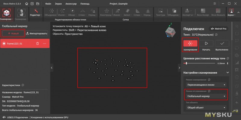 Отдельно скажу про режим «Глобальный маркер». Многие его игнорируют, а зря. Раскладываете маркеры вокруг объекта, жмете «+Новый» и «Начать», а затем сканируете фон. Алгоритм запоминает их положение (у меня определил все 36) и можно использовать эти данные если маркеры не меняли положение. При съемке крупных объектов это спасение: если резко сменить ракурс, система моментально поймет, какой участок сейчас в кадре, сверяясь с сохраненной «картой».