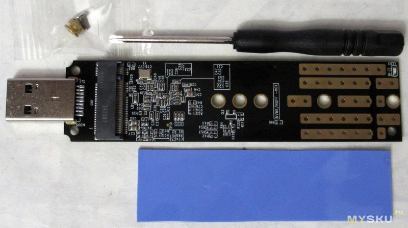 Попались тут переходнички по интересной цене, заодно посмотрел на 2х(на самом деле 3х — он еще и sd умеет, но не здесь)интерфейсный контроллер от jmicron — jms581dl. Такой формат удобен для быстрого кратковременного подключения накопителя. Комплект — сам переходник, крепеж, отвертка и зачем-то термопрокладка: