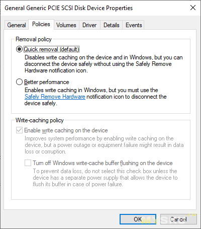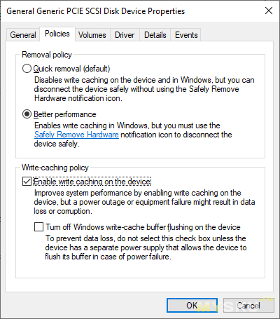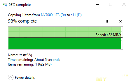 копирование больших файлов на, с умолчательно отключенным и включенным кешированием записи — 430 и 470MB/s: