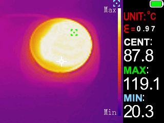 Раньше я с тепловизорами не взаимодействовал, поэтому получил истинное удовольствие от тестирования его возможностей. У устройства (в режиме тепловизора) есть разные цветовые палитры для отображения. Переключаются они как в меню, так и одной из красных кнопок на мультиметре. White Hot (Горячий белый), Black Hot (Горячий черный), Blue (Синий), Iron Red (Железный красный), Color (Цветной), Red Hot (Горячий красный), Fusion (Слияние), Rainbow (Радуга).