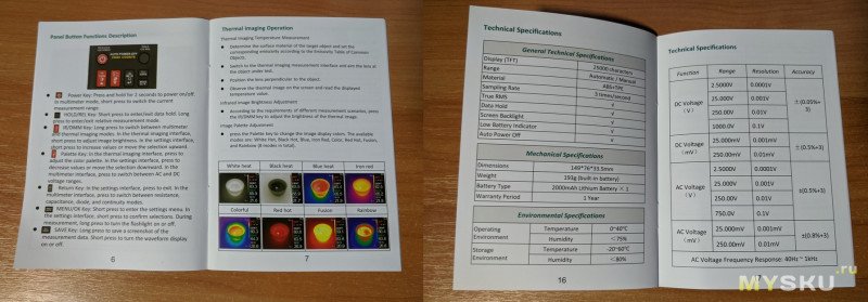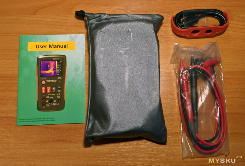 Помимо устройства, есть пара щупов, крышечка для установки линз на модуль тепловизора, кабель USB A-C, чехол-сумка и инструкция на английском языке. Я не склонен зацикливаться на инструкциях, однако эту не могу не отметить: