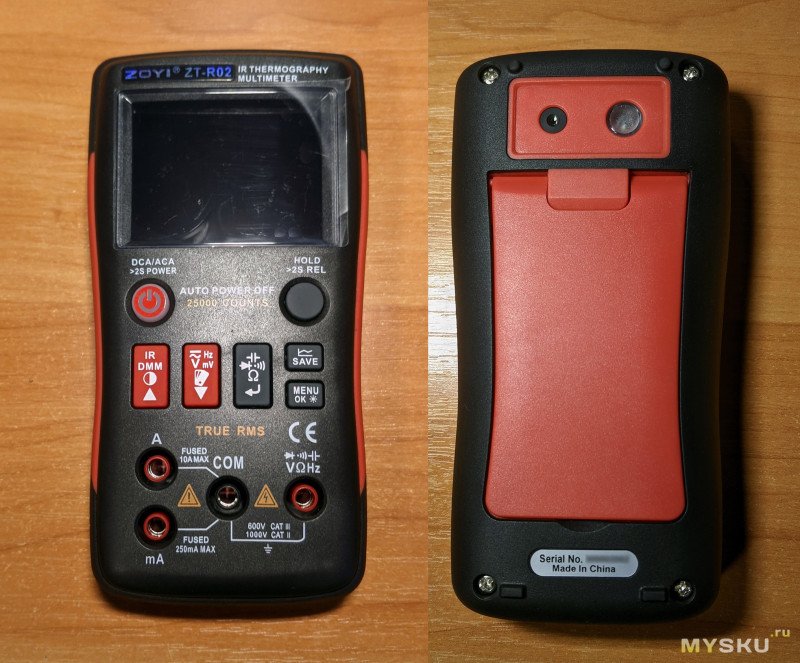 Как и любой мультиметр, Zoyi ZT-R02 имеет ножку. Вот такой угол наклона получается, если поставить мультиметр на эту ножку.