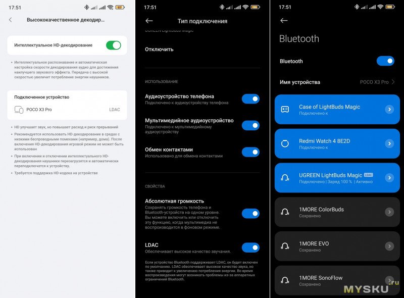 Если использовать SBC и ANC (по умолчанию в SBC) и выкрутить громкость под 90%, то гарнитура проработает 5+ часов (если отключить шумоподавление то 7 часов 50 мин.), выключаются каналы практически синхронно, после третьего сообщения голосом про низкий заряд. При использовании LDAC время автономки проседает до ~5 часов без шумодава.