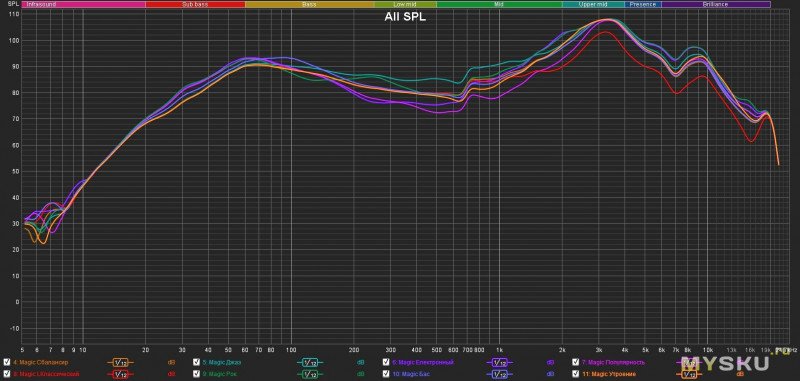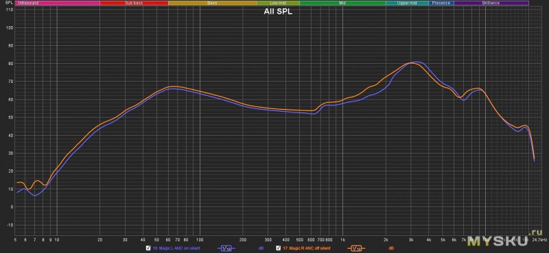Измерения показали стандартно приятную для уха и классически «вкладышную» АЧХ без сибилянтов и выпиливания слуха — хорошо прорисован голосовой диапазон и на заднем плане высокие, бас полностью зависим от плотности посадки в ушной канал и если она свободна, то и ждать бас — не стоит (на графике отображена максимально плотная посадка с кастомной, силиконовой амбущюрой):