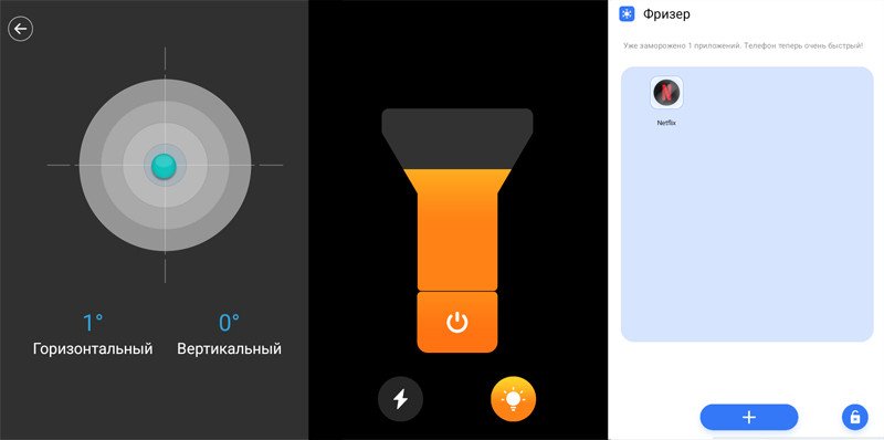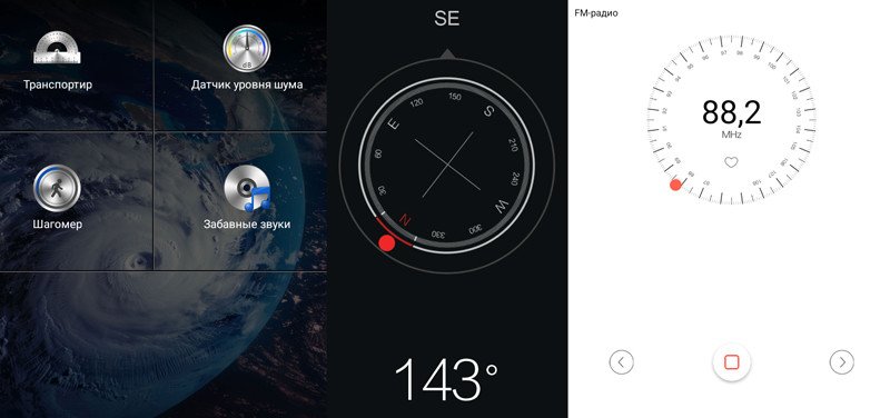 Предустановлено нескольких приложений, среди них: полезные инструменты (компас, отвес, транспортир, шумометр, шагомер), FM-радио, морозилка для заморозки приложений работающих в фоне, фонарик с возможность регулировки яркости. Кстати фонарик в планшете яркий.