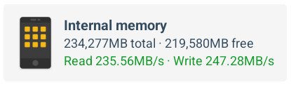 Скорость чтения внутренней памяти составляет 235 МБ/сек, скорость записи 247 МБ/сек.