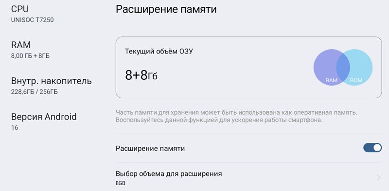 • Процессор: 8-ядерный Unisoc T7250, с графикой Mali-G57;• Память: 8 ГБ оперативной (с возможность расширения до 16 ГБ, за счет встроенной памяти) и 256 ГБ встроенной памяти (бывают версии на 128 ГБ);