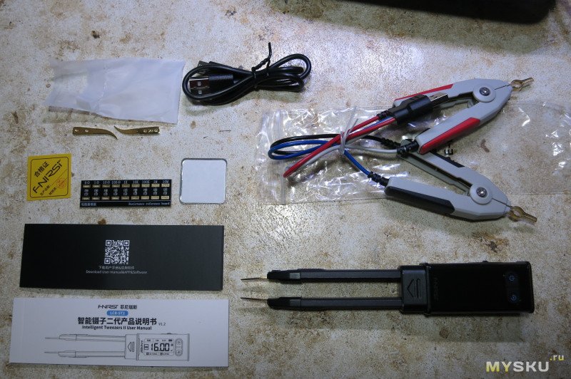 В комплекте идут изогнутые сменные щупы, кабель USB, платка с резисторами, металлическая пластинка с двусторонним скотчем, документация, щупы Кельвина и сам пинцет с установленными щупами.