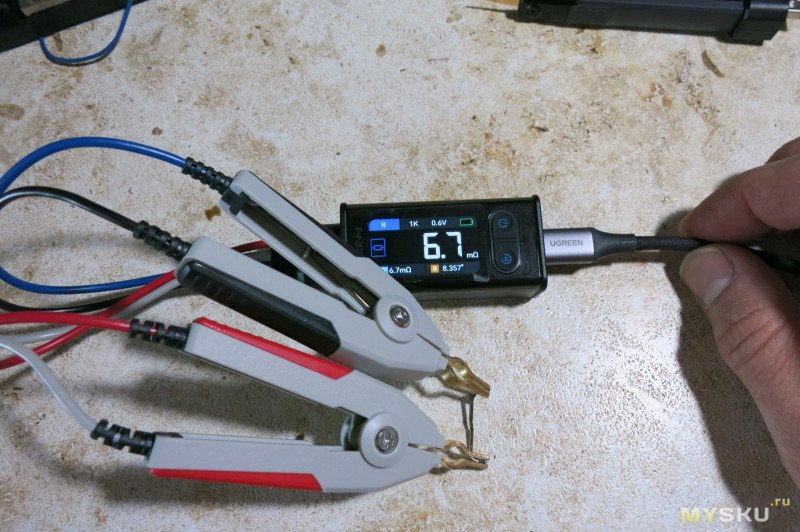 2) Короткие/жёсткие провода щупов Кельвина — могли сделать лучше. Даже если не брать силиконовые провода, ведь есть марки обычного провода, который более мягкий/гибкий.