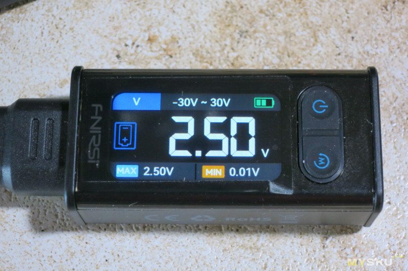Проверка напряжения. В нижней части показывает минимальное и максимальное измеренное напряжение.Показывает полярность напряжения, символ батарейки переворачивается.