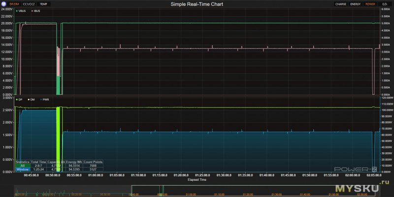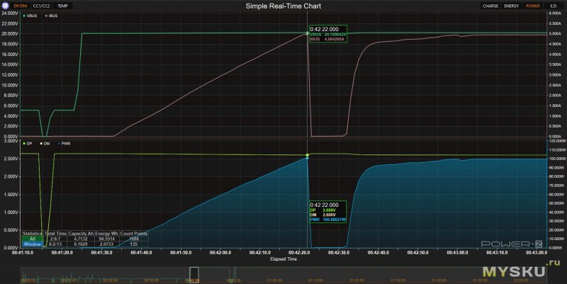 маленький эпик (где-то или перегруз или всплеск и зарядное сбросило протокол), опять поднимаем мощность, фиксируемся на 100Вт, отлично всё работает