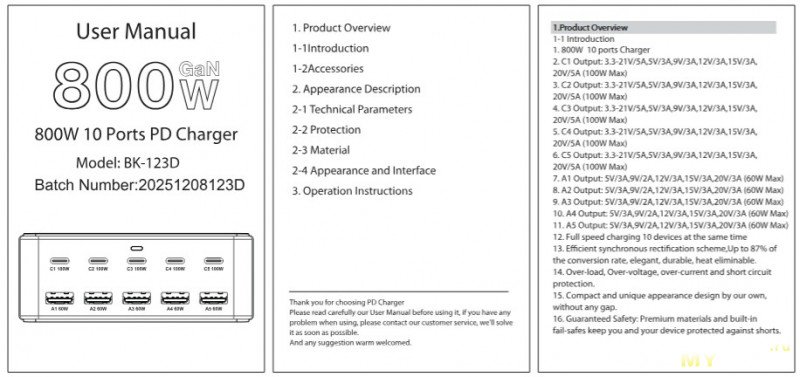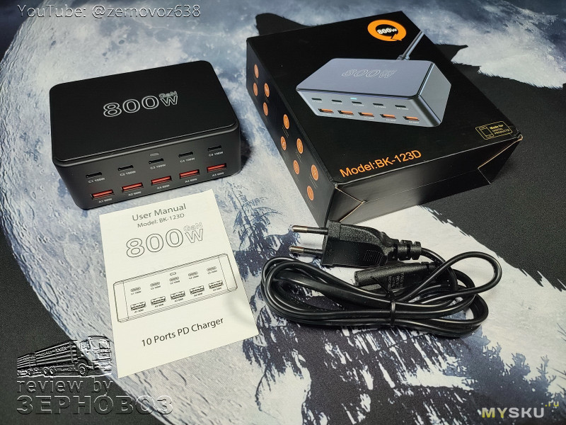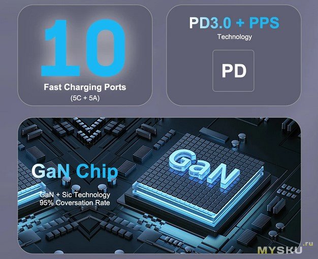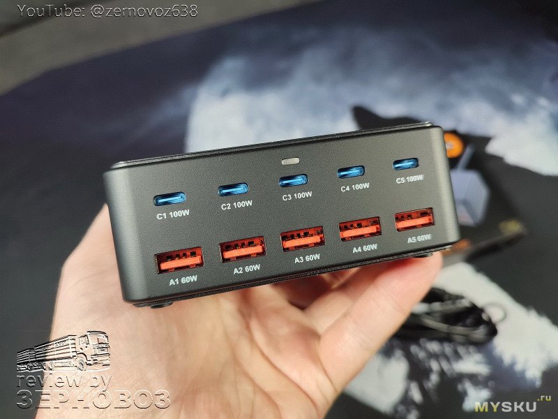 Кто хочет 800W за 30$? Я хочу. Вот мои деньги — дайте два. Что ещё? 10 портов и на каждый 100Вт по USB C и по 60Вт на USB-A. Высокоэффективный GaN чип. Компактный размер, высокая эффективность и низкий нагрев. Так написано в магазине и инструкции. Ах да, более 1000 отзывов.