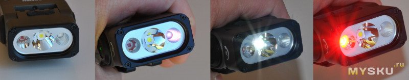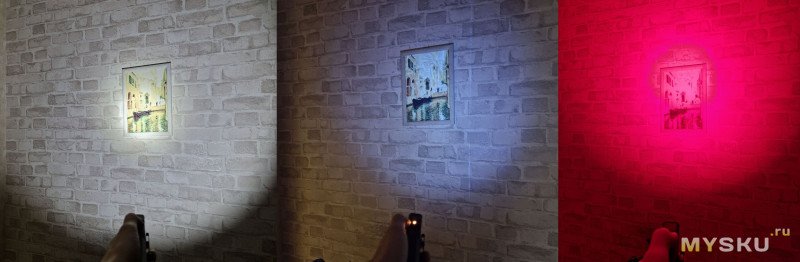 Фонарь ориентирован на свечение в даль, есть хотспот, угол луча около 90 градусов. Красный очень яркий, заливной.УФ рассеянный для зоны работы 0,4-0,8 м, доступно два режима яркости.