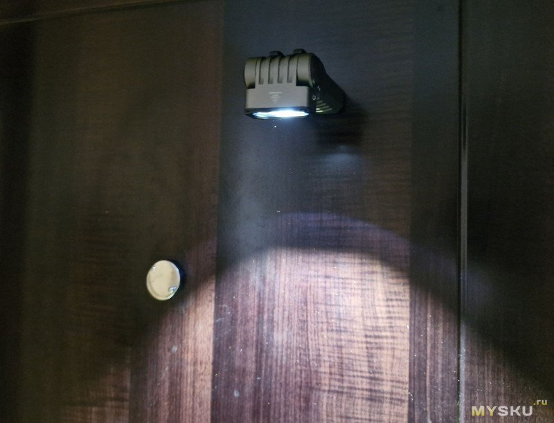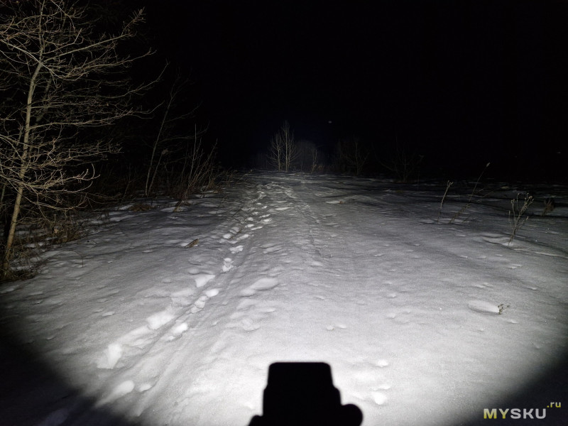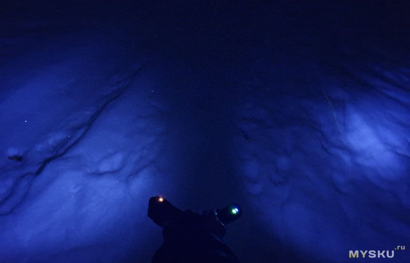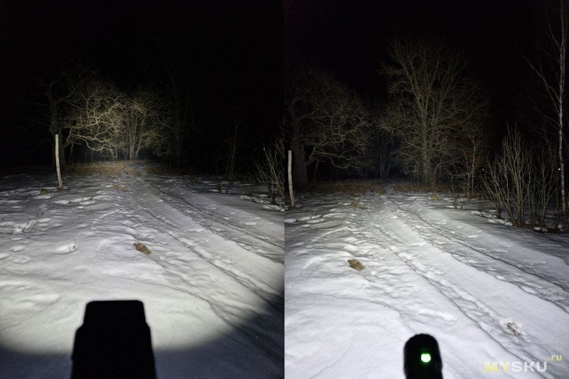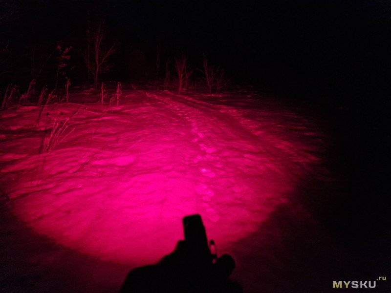 Зона уверенного освещения около 50 м. По темным тропинкам уже можно спокойно ходить на 500 люмен.Красный: