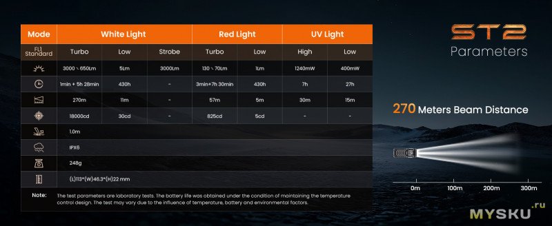 Еще неплохо реализовано управление: тут магнитный переключатель режимов с датчиком Холла, герметичный и с четкой фиксацией и логикой. Центр — белый, влево — красный, вправо — УФ. А в центре переключателя кнопка активации света с индикатором заряда (при удержании — плавная регулировка яркости). Управлять ST2 можно и в перчатках.Измеренная на весах масса ST2 243 г. Не совсем EDC формат по массе.