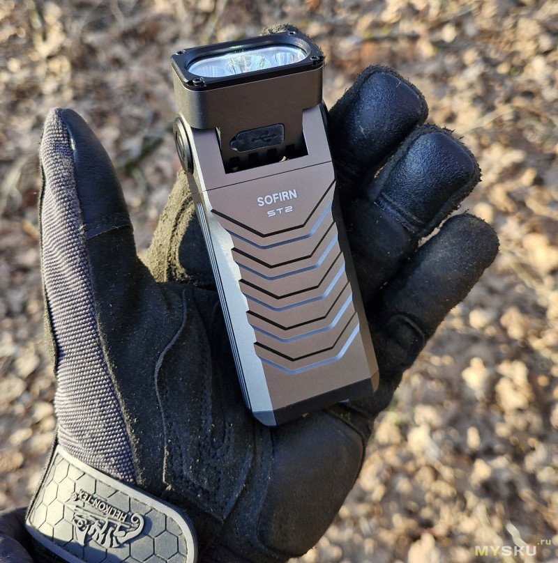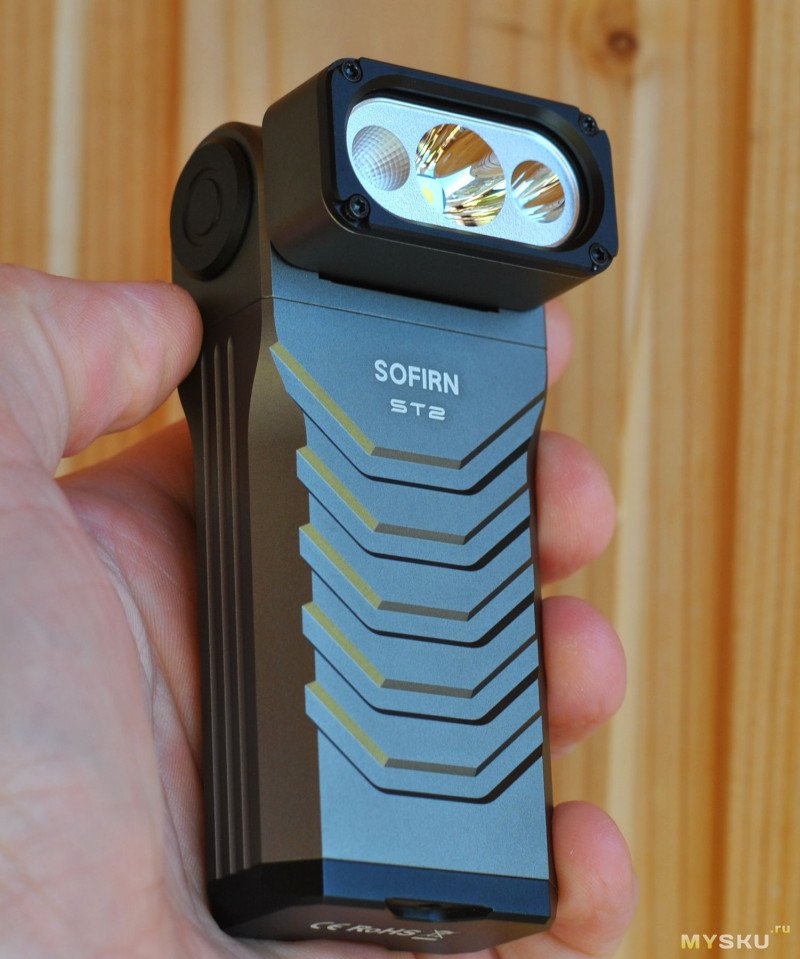 Светодиодный фонарь SOFIRN ST2 — это многофункциональный световой инструмент, который удачно совмещает черты тактического, рабочего и туристического фонаря. Он создан для тех, кто ценит универсальность и готов отказаться от компромиссов в пользу практичности. Сочетание трёх излучателей света, поворотной головы, магнита и клипсы делает его гибким решением для самых разных задач. Корпус крепкий, защита от влаги по IPX6. Тут серьезный запас по яркости, удобное управление с плавной яркостью, скрытая мигалка на основном свете (многих она бесит), запас по времени работы (до 5 часов на 650 люмен).Но не обошлось без досадных минусов: элементы питания без быстрой замены (крышка на мелких винтах), избыточная масса (стенки батарейного отсека можно было сделать тоньше).