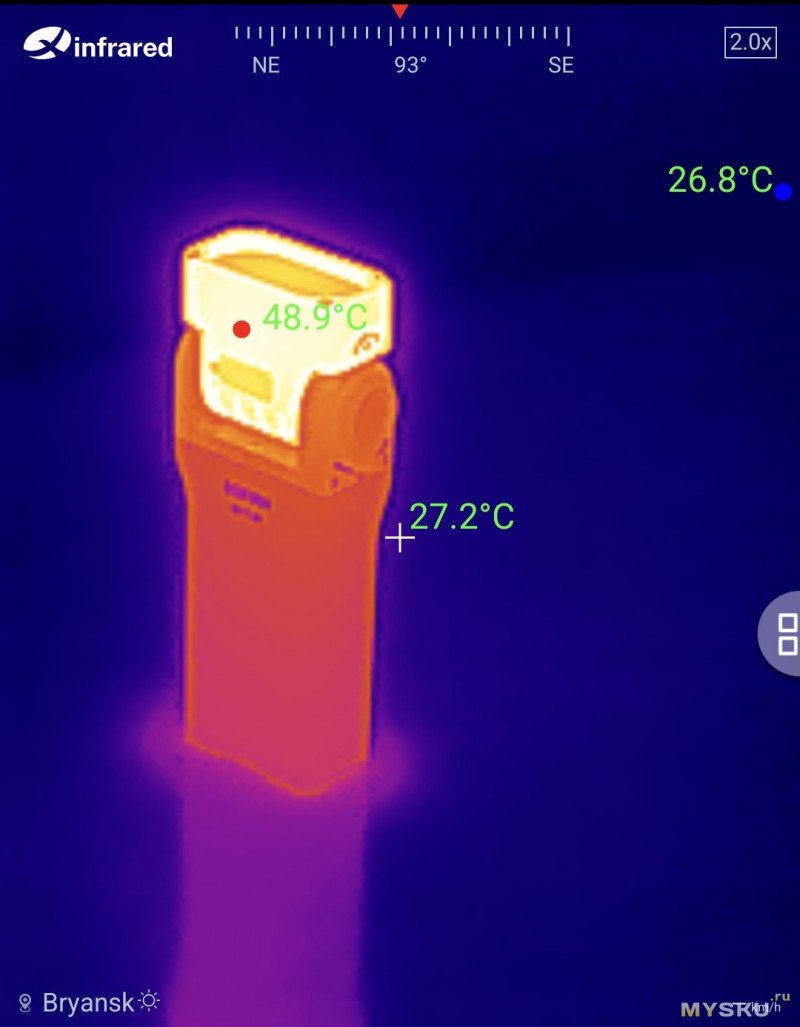 Нагрев только в районе поворотной головы, и то термоконтроль не позволяет греться выше 55С: