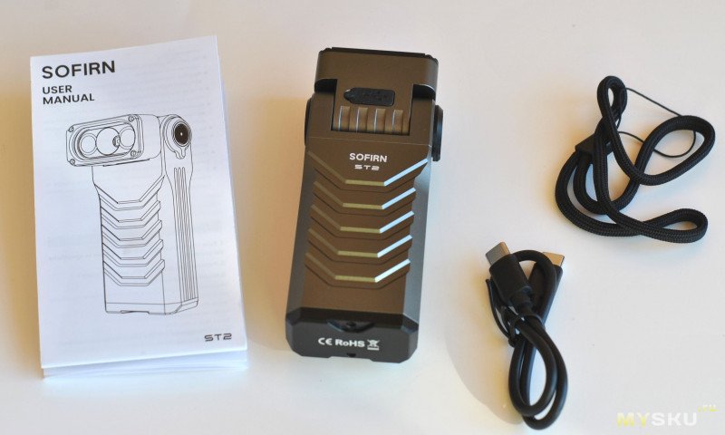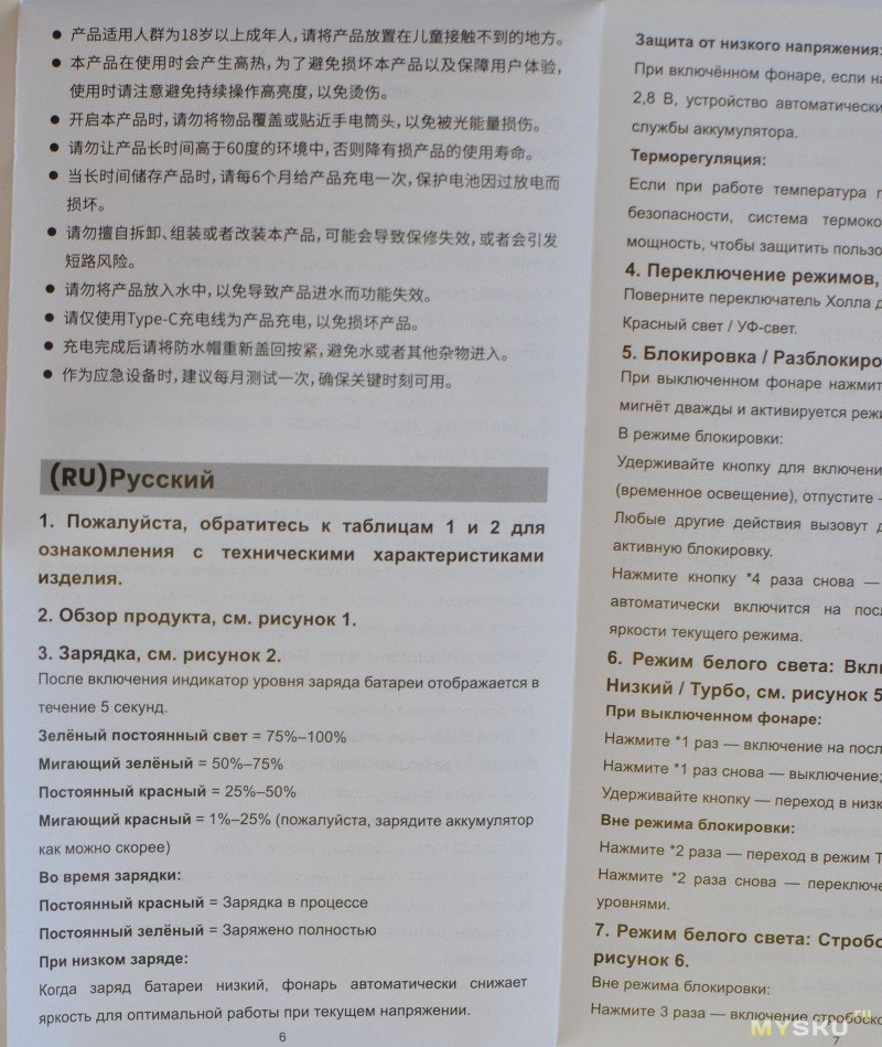 Помимо самого фонаря, есть мультиязычная инструкция, зарядный кабель 30 см и темляк на кисть.Есть русский в руководстве: