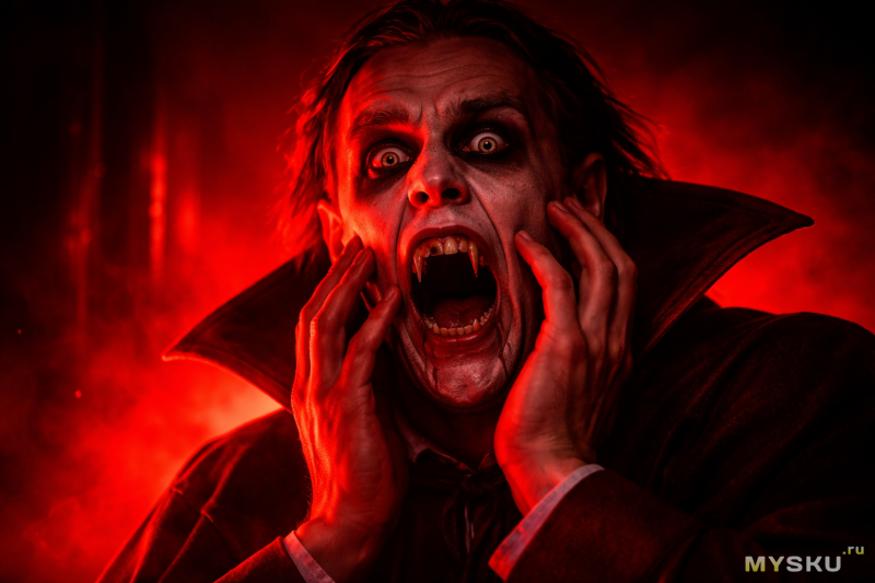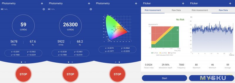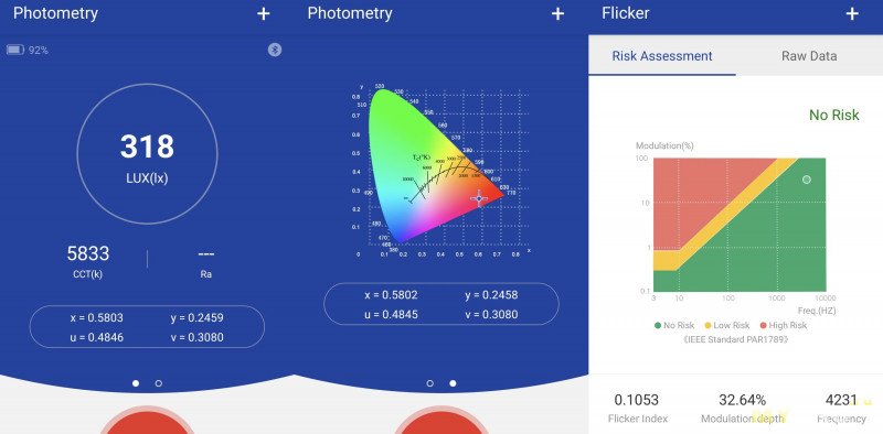 Температура света не выходит за 6000K, пульсаций нет даже в мунлайте.Красный: