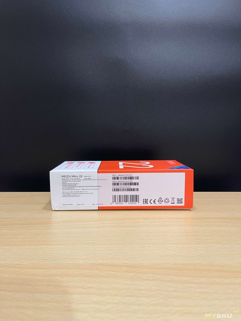 Коробка Meizu Mblu 22 сразу бросается в глаза благодаря обновленному фирменному стилю. Если вы когда-нибудь держали в руках смартфоны Tecno, то почувствуете эффект дежавю: компоновка элементов и цветовая игра практически идентичны.