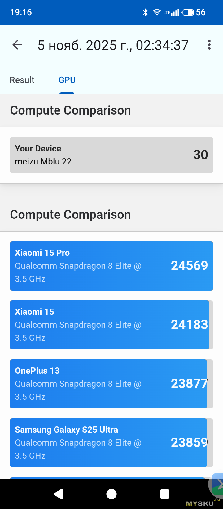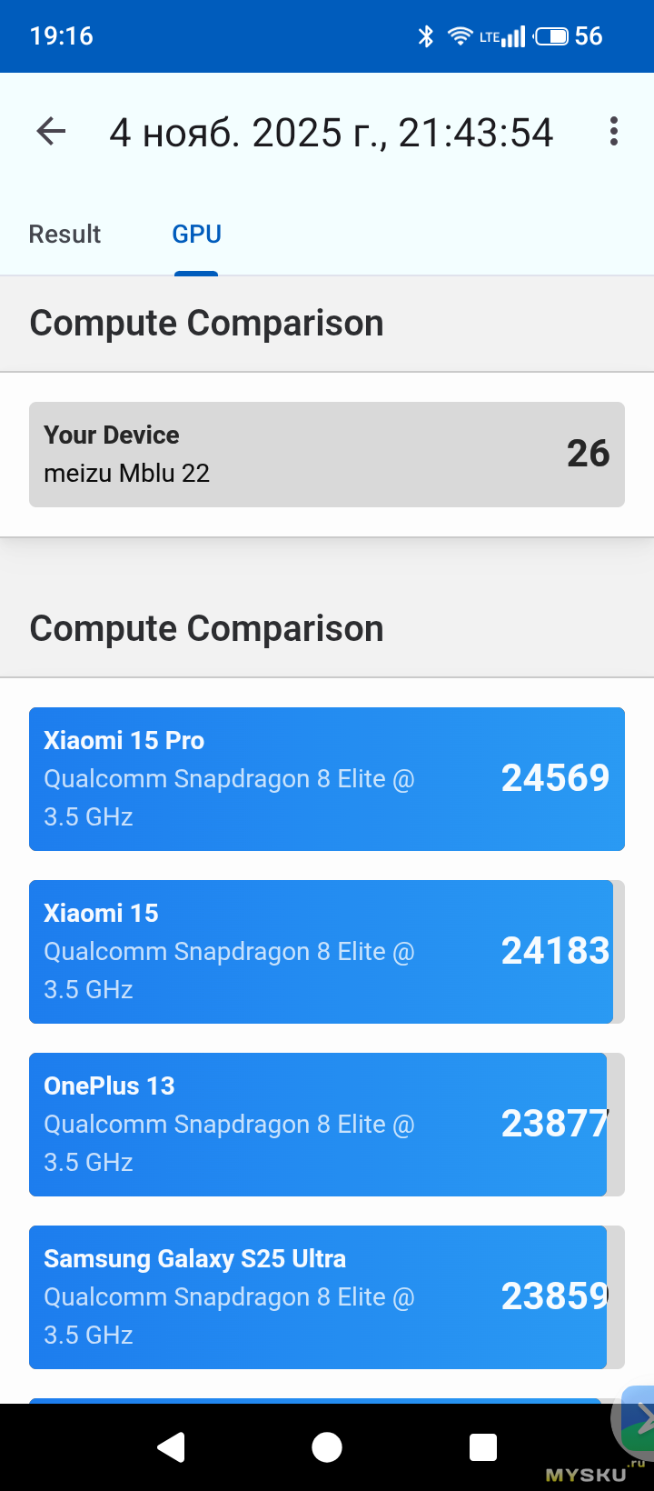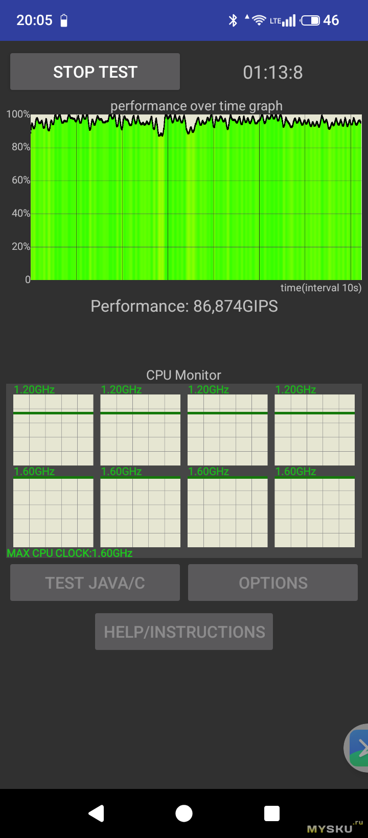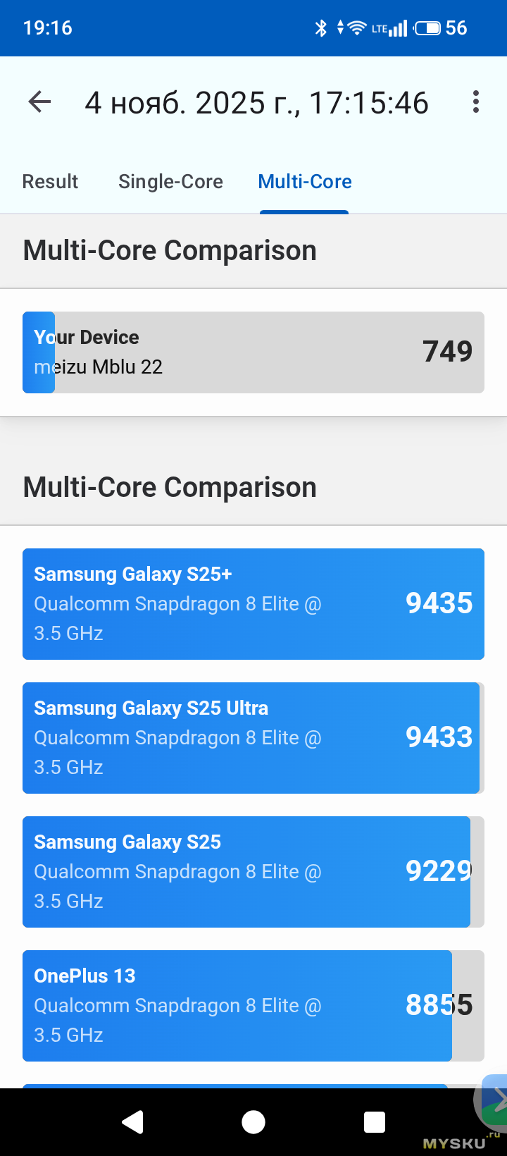 Стресс-тест процессора подтвердил высокую стабильность Meizu Mblu 22. В ходе многократных прогонов в CPU Throttling Test смартфон не уходил в агрессивное ограничение частот, демонстрируя ровную производительность на протяжении всего испытания.
