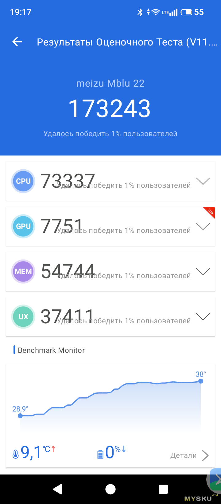 В Antutu телефон выдал 173243 балла. Однако, стоит учитывать, что современные процессоры неплохо оптимизированы под синтетические тесты.