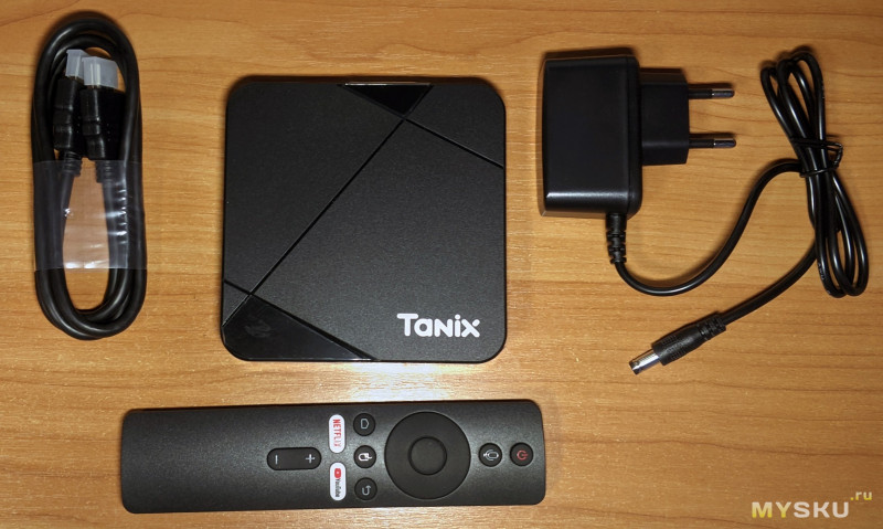Комплект стандартный: приставка, пульт, HDMI и адаптер питания (5V/2A).