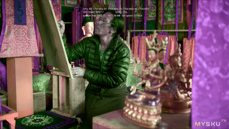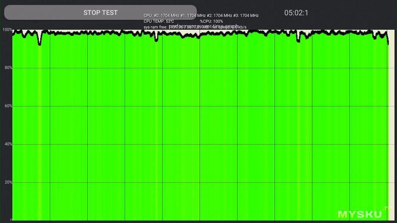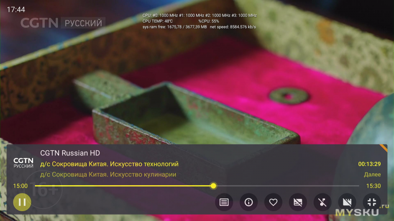С нагрузкой приставка справляется хорошо: частоты держит, температура стабилизировалась на 53°C.