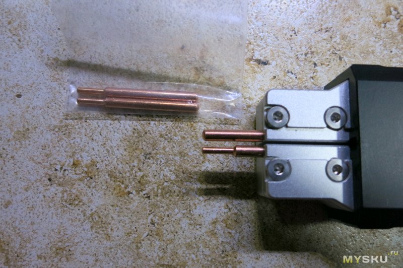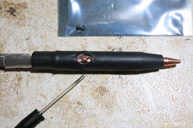 Электрод фиксируется в медной гильзе двумя винтами, для которых есть комплектная отвертка. Есть и два запасных винта.