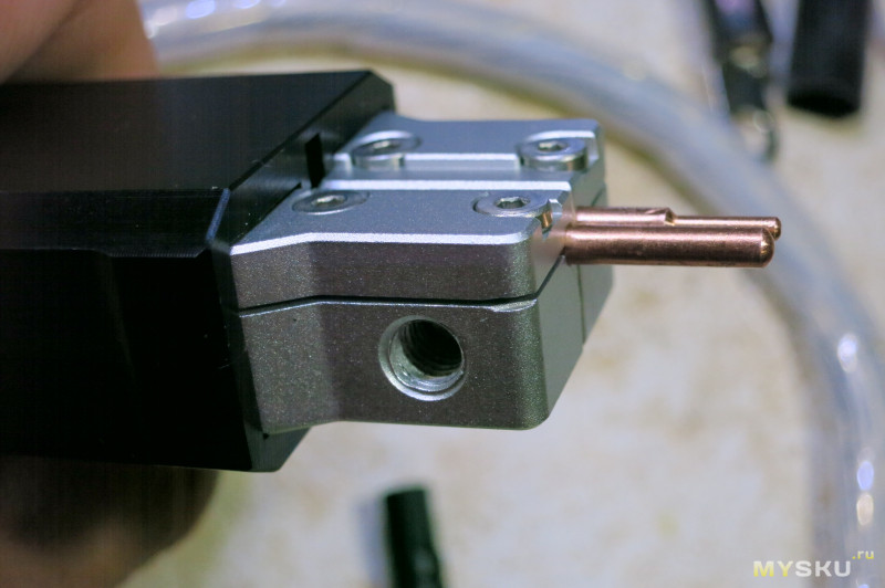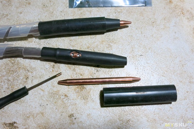 Медная трубка закрыта термоусадкой и после фиксации винтами наверх надевается резиновая оболочка.