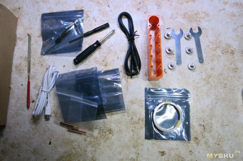 Ручка с электродами весит 160 грамм, это важно, если махать ей целый день при сборке батарей.