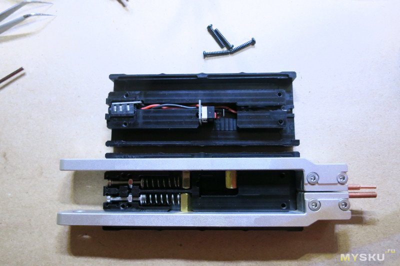 Чтоб разобрать ручку, нужно открутить 4 винта. Ток передают две алюминиевые шины, в них вкручены три латунные втулки — одна для микрика и две для пружин.