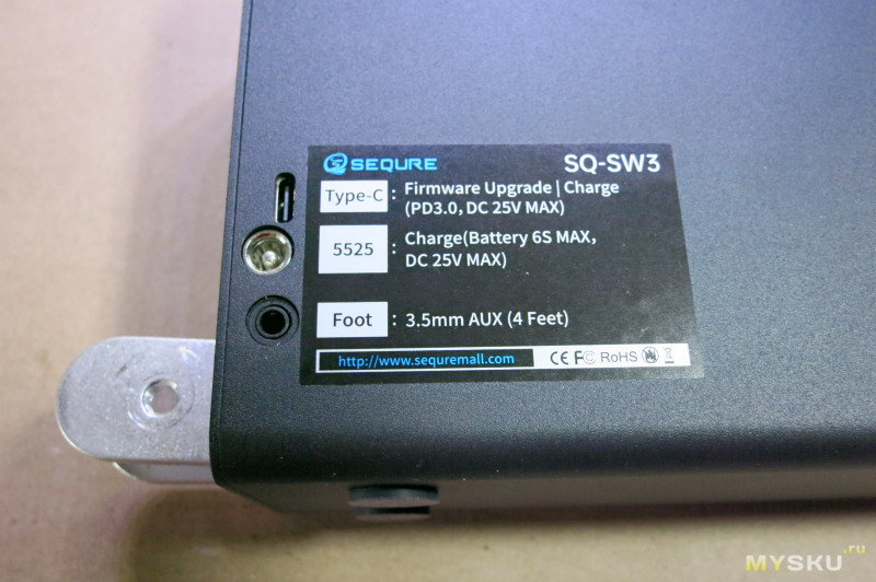 На правой части гнездо подключения педали и два разъема зарядки: type C и DC5525.