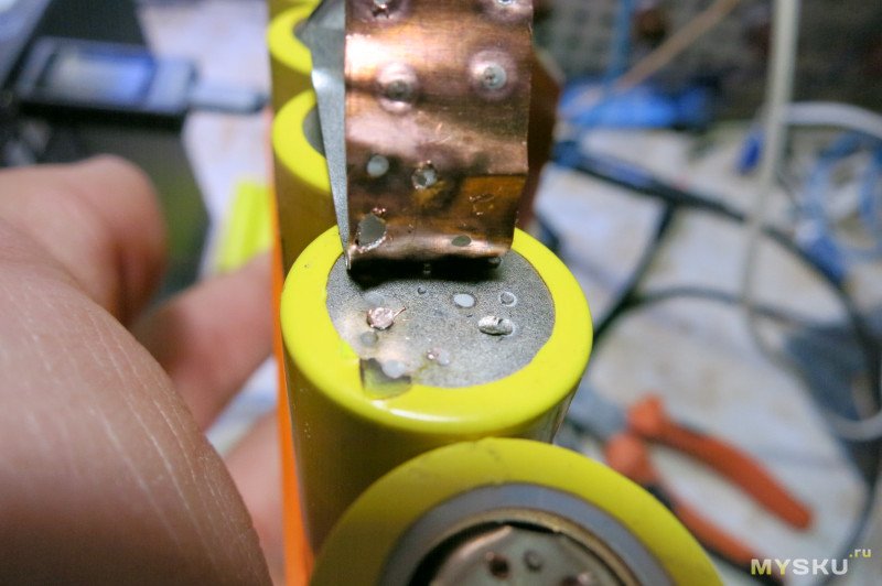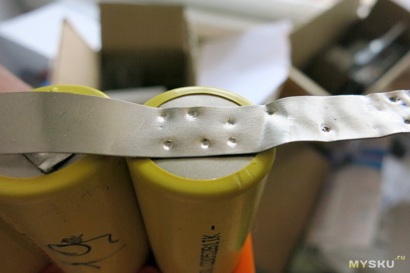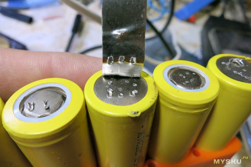 Обычно аккумуляторы соединяют лентой. Она бывает стальной с покрытием никелем, никелевой и даже медной. Стальная варится проще всего. Никелевая варится чуть хуже, но никелевая лента не ржавеет и у нее чуть ниже сопротивление. Медная лента варится значительно хуже и у нее значительно ниже сопротивление.