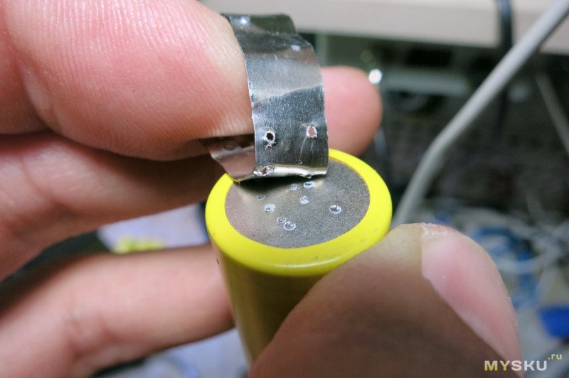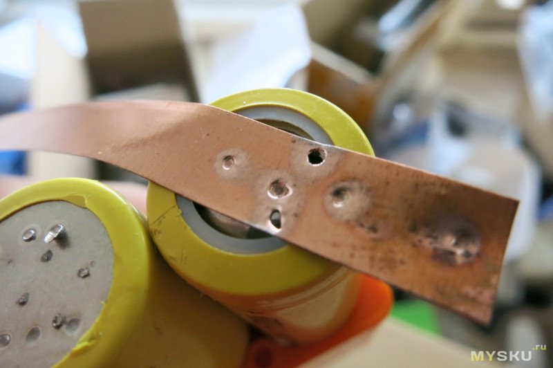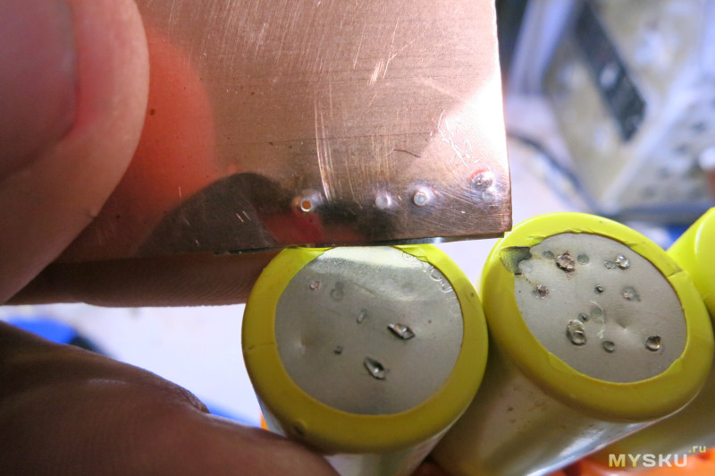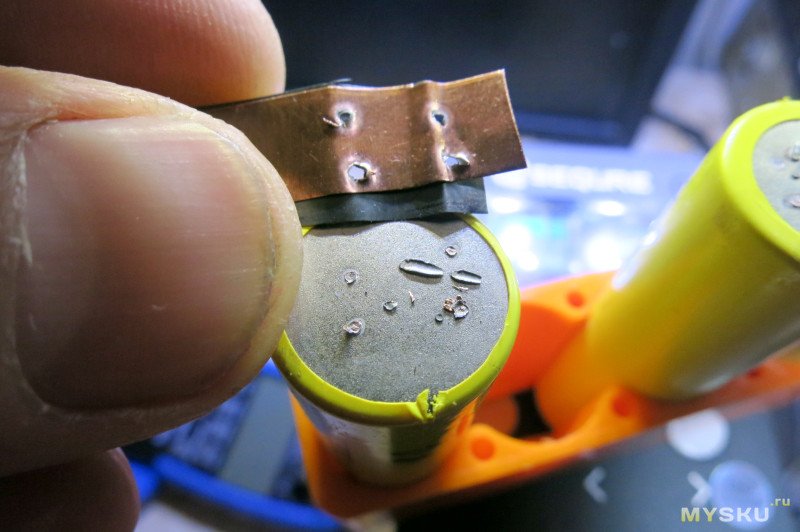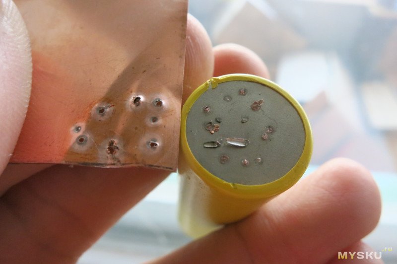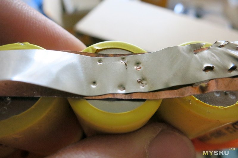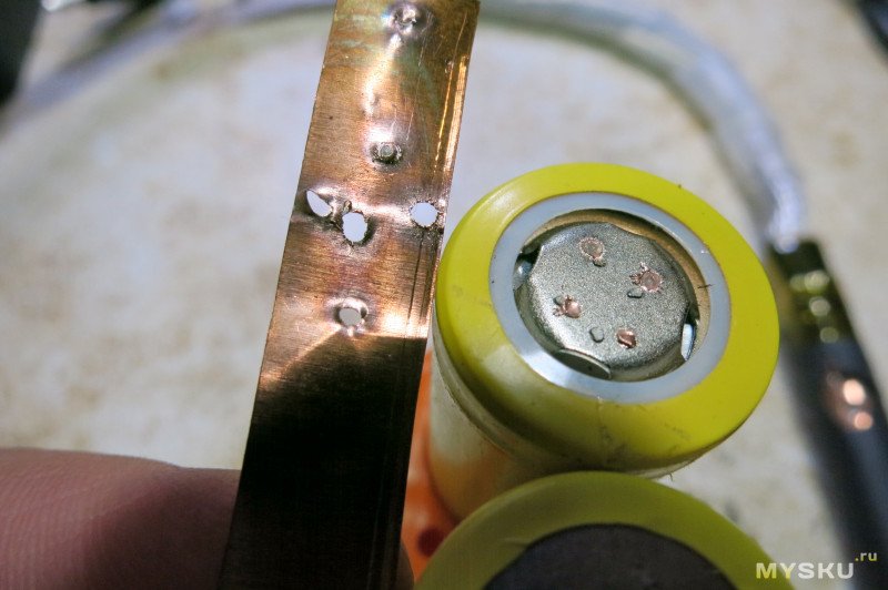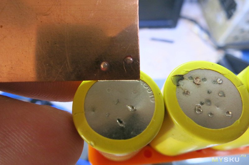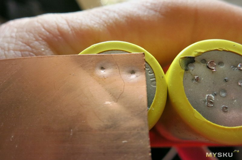 При этом сварка особо не поменялась, выглядит так и отрывается все равно с дырами.На этих фото видно, что правый электрод оставляет следы меди. Он липнет сильнее. Я пробовал менять провода местами, все равно правый плюсовой прилипает сильнее.