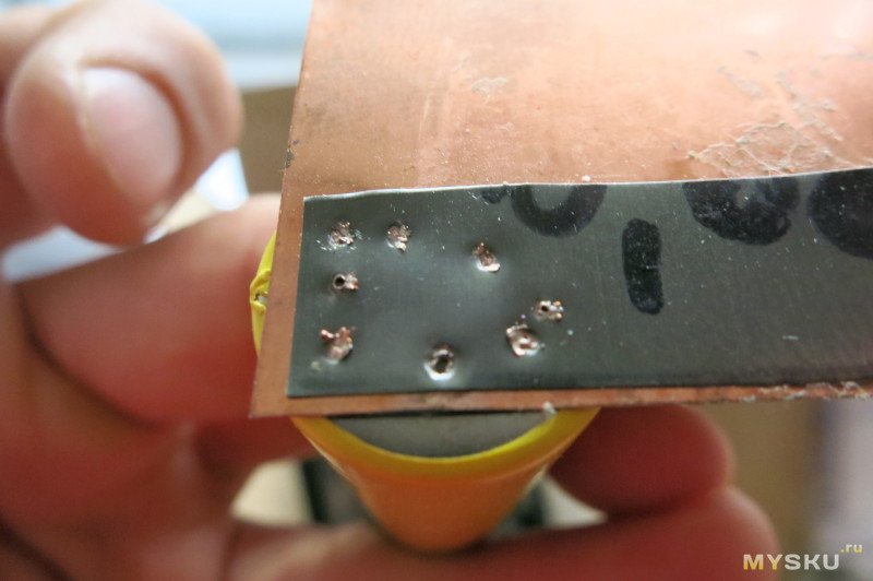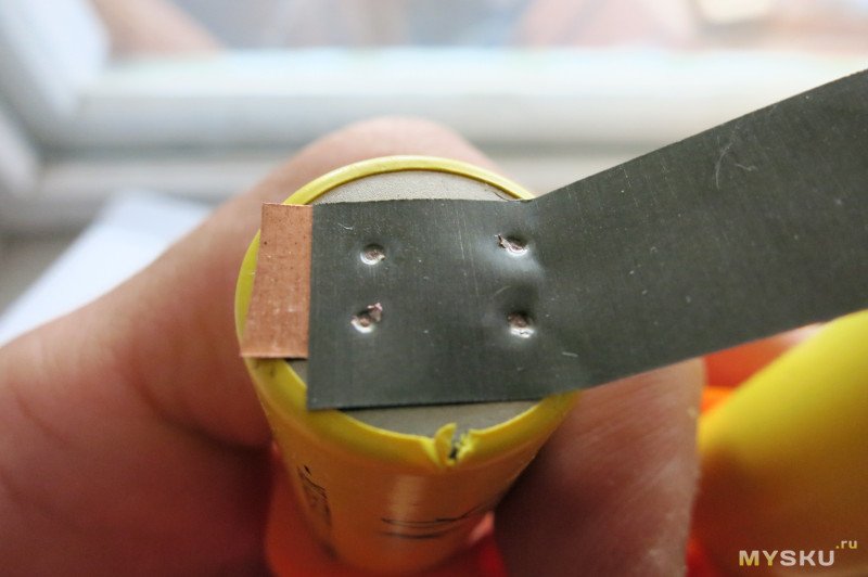 Выставил один импульс длительностью 8мс, приваривается.Но у такой тонкой меди небольшая механическая прочность, она легко отрывается с отверстиями.