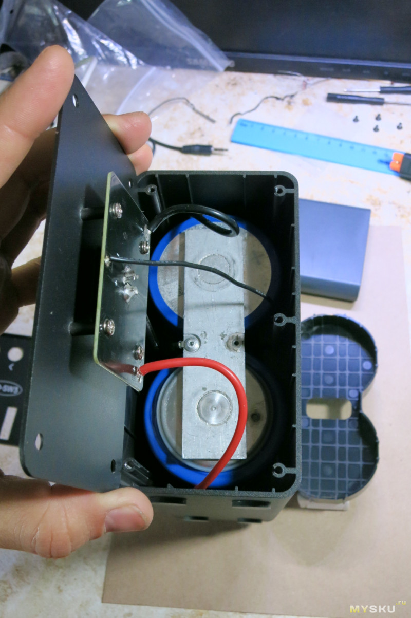Так же снимается задняя панель, под ней крышка. Под крышкой (она на фото лежит справа от сварки) два ионистора. Если залезть глубоко в нутро сварки, то можно выкрутить что-то и вытащить их. Не стал лезть туда.