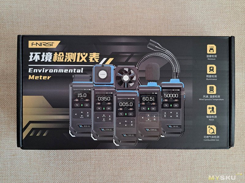 Прибор входит в семейство датчиков от FNIRSI для измерения параметров «окружающей среды». Поэтому на коробке изображено сразу несколько моделей.