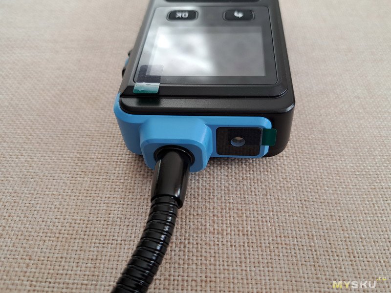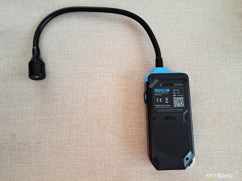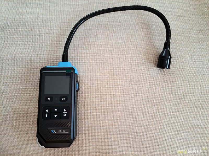 А вот так выглядит сам детектор. Как видим, датчик вынесен на гибкой ножке отдельно от корпуса. Длина гибкой ножки вместе с датчиком составляет 35 см.