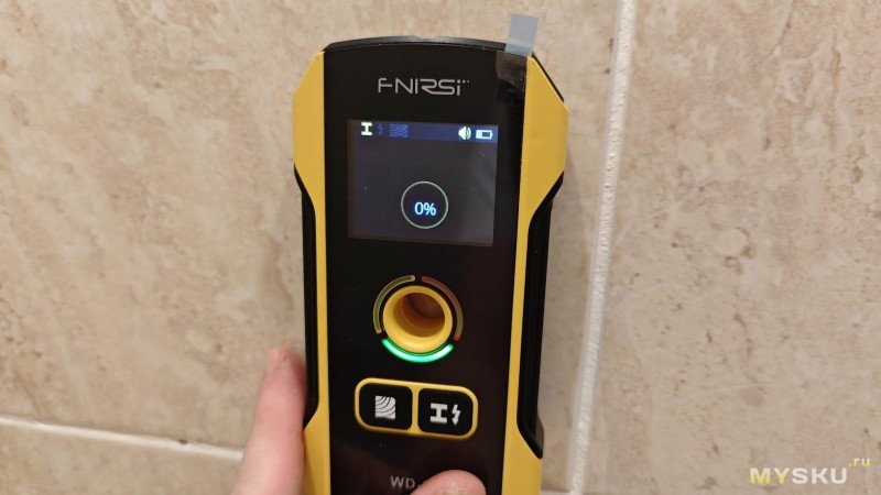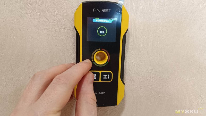 Перед каждым измерением прибор производит автокалибровку. Для этого плотно прикладываем прибор к стене в месте, где заведомо нет искомых объектов (пустая зона). Ждём, пока серая надпись «Калибровка» не сменится на зелёную «Калибровка завершена». На это детектору требуется пара секунд.