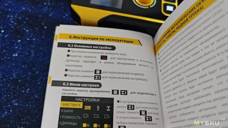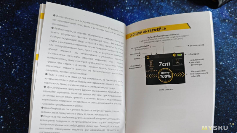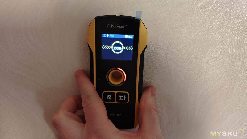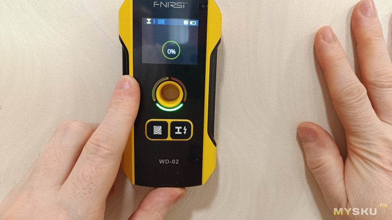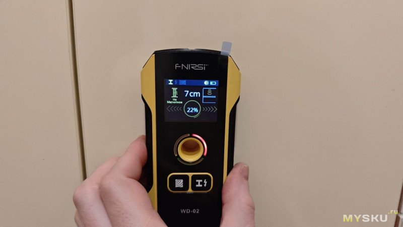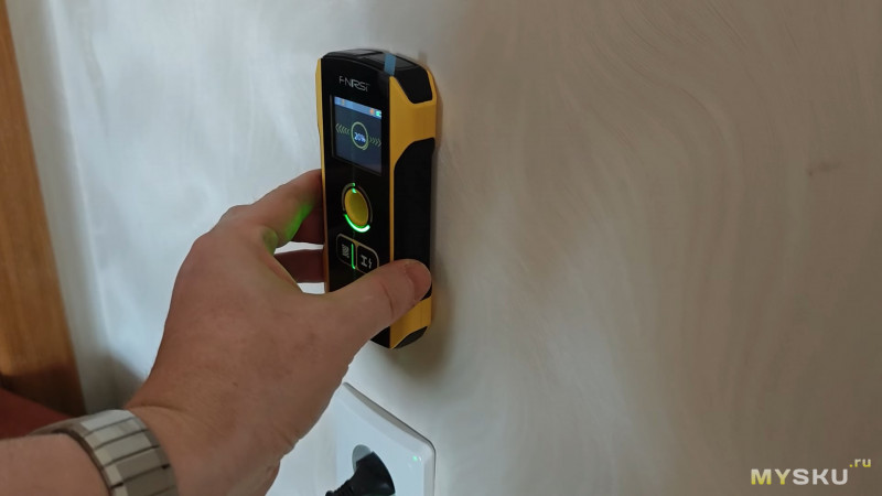 Для повышения точности измерения желательно снять с рук часы и кольца (это я узнал потом). При поиске скрытой проводки рекомендуется вторую свободную руку прижать к стене на расстоянии 20–30 см — это снимает статику и улучшает точность поиска.