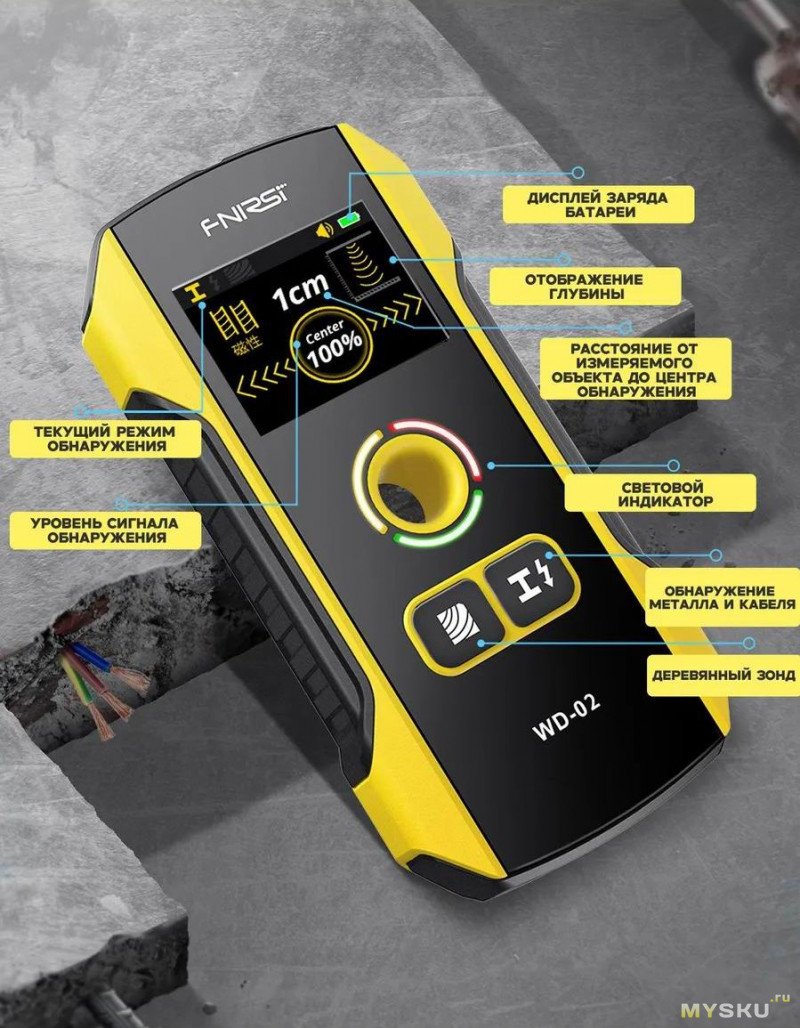 Детектор FNIRSI WD-02 — это модернизированная версия предыдущего, аналогичного по характеристикам прибора WD-01. Новую модель отличает яркий цветной TFT-дисплей и переработанный пользовательский интерфейс. Также добавлена поддержка русского языка в меню. Основной функционал остался прежним — поиск скрытой проводки, металлических конструкций и деревянных деталей внутри стен или каких-то иных конструктивных форм.