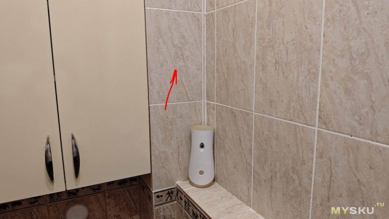 Испытание прибора начнем с поиска алюминиевого профиля, из которого сделан короб под гипсокартоном и керамической плиткой. Стрелкой указано его расположение.