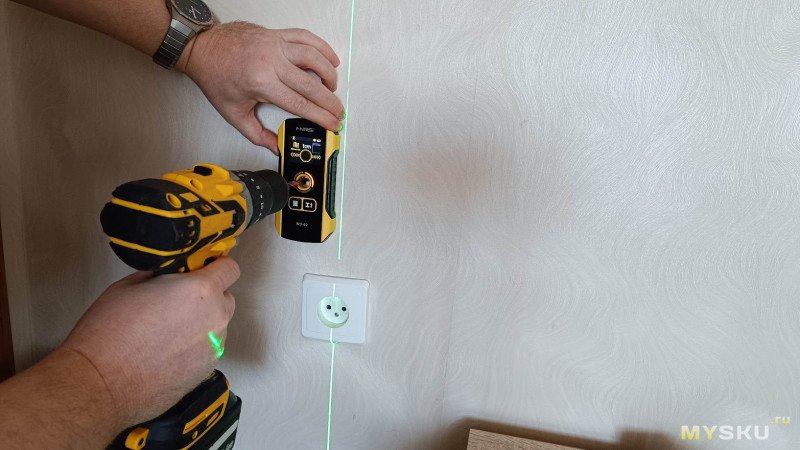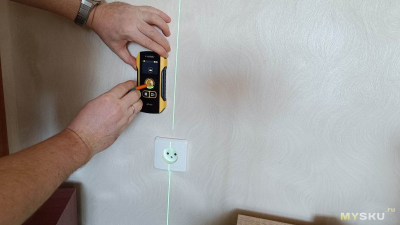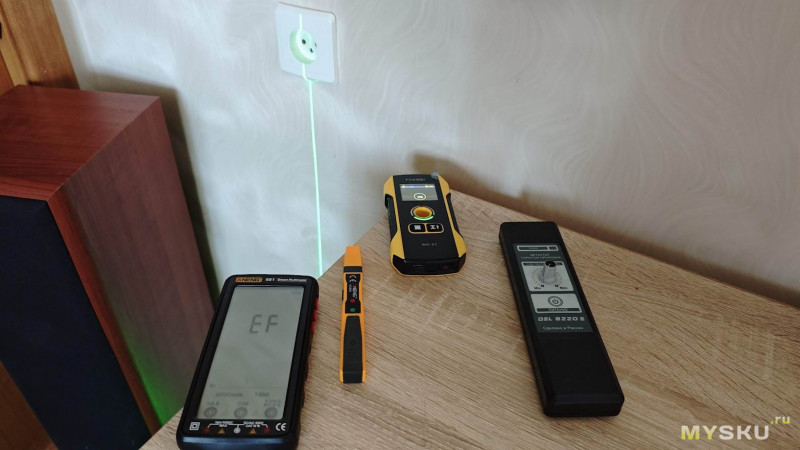 Искать будем проводку, ведущую к розетке. Я точно знаю трассу её прохождения, поэтому подсвечу её лучом лазерного уровня. FNIRSI WD-02 готов приступить к финальному испытанию вместе с остальными соперниками.
